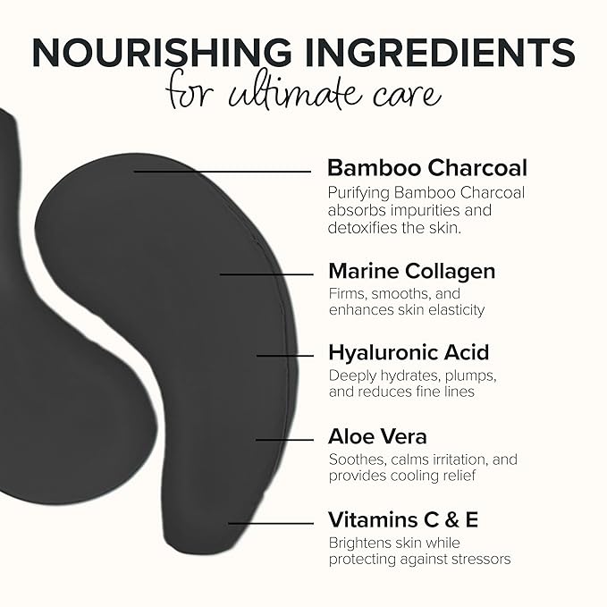 - Soothe & Moisturize: The eye patches for puffy eyes and dark circles are complemented with bamboo charcoal, which, when combined with hyaluronic acid, aloe vera and other ingredients, encourage a smooth, puff-free skin