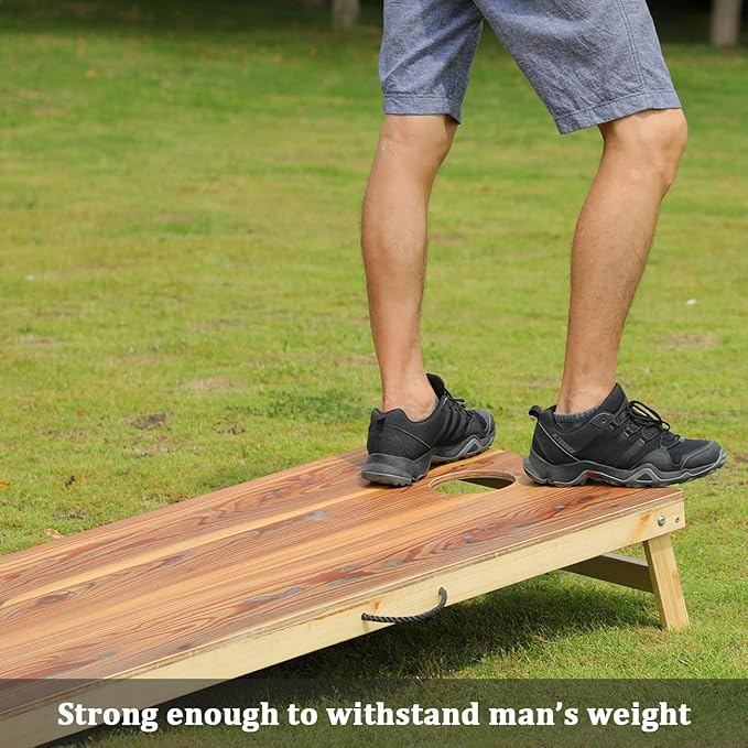 - Better Game Experience: Cornhole set is constructed of solid hardwood, foldable board legs are reinforced with metal screws, so it can prevent bouncing and slipping more effectively, bring more fun to your game. A great gift for thanksgiving day and christmas