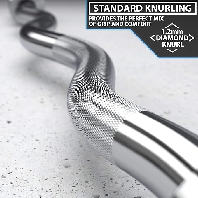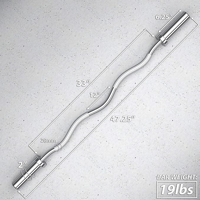 - ★ WHAT’S IN THE PACKAGE ★ – This EZ Curl bar is finished with Chrome, 19 lbs, 47.25 inches long, 28 MM in diameter, and has 6.25” of loadable sleeve length on either side.