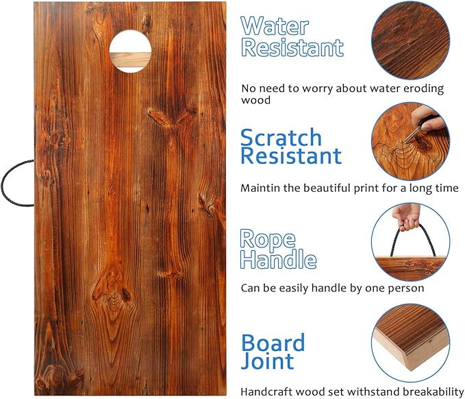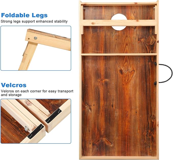 - Solid Construction: Cornhole sets are made from premium solid wood, it is heavy duty and stable with the legs support and strong hardwood frames, the boards will not sway or bounce when the bags hit them