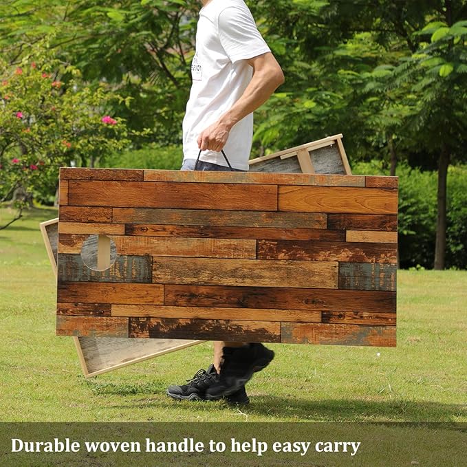 - Portable Cornhole Set: The foldable legs make the board easy to set up, velcros stick 2 boards together for easy transportation with convenient durable woven carry handle. You can enjoy the corn hole game anywhere. A great gift for thanksgiving day and christmas