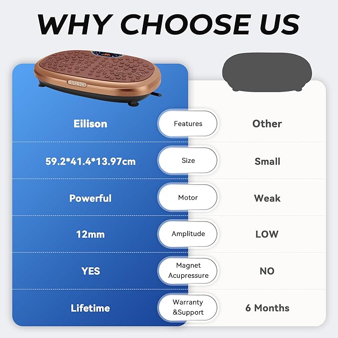 - CUSTOMER SUPPORT: Eilison's vibration platform machine is engineered to deliver unparalleled quality and industry-leading specifications. We are dedicated to providing you with outstanding support. For any inquiries or concerns regarding your vibration plate, please reach out to us directly