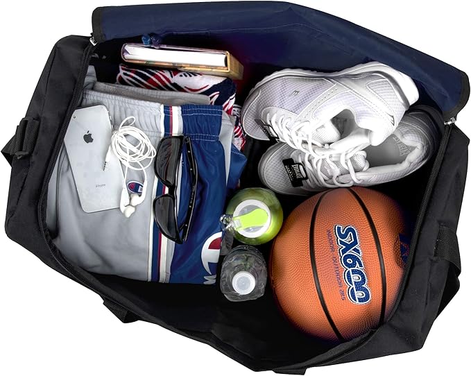 - DIMENSIONS: Navy blue duffle bag measures 22” x 12” x 9”