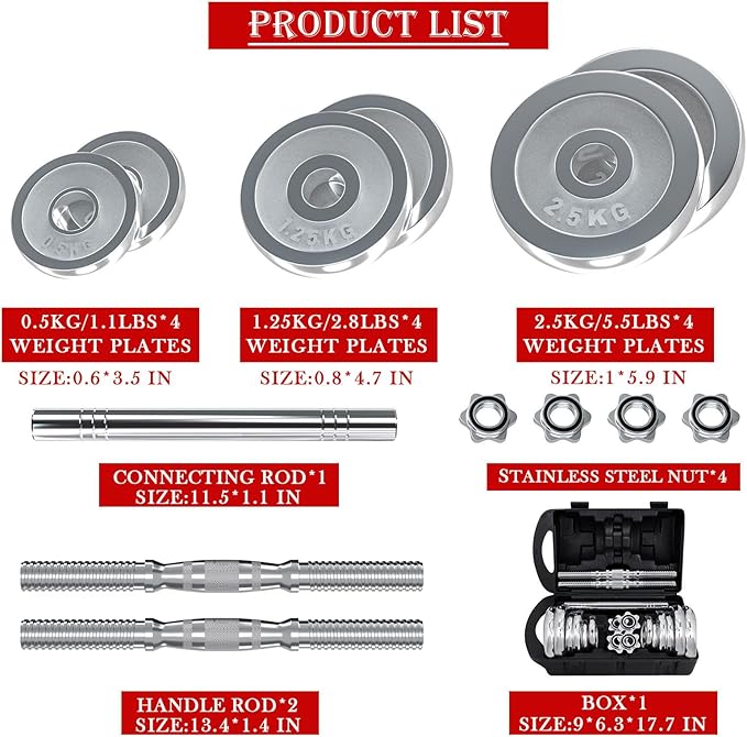 - 【Package List】- Package included 1x connector, 2x dumbbell bar, 4x nuts, 4 x 1.1-pound plates, 4 x 2.8-pound plates, 4 x 5.5-pound plates, 1 x exquisite gift box.