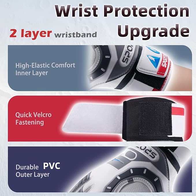 - DOUBLE WRIST SAFEGUARD:- These soccer gloves have a double-designed wristband whose lining layer is elastic stuff and the outer is close-fitting velcro bandage with stretch-strap, so they can offer more secure protection to reduce the sprained wrist risk of your child. The opening design of the wrist makes it easier to wear gloves.