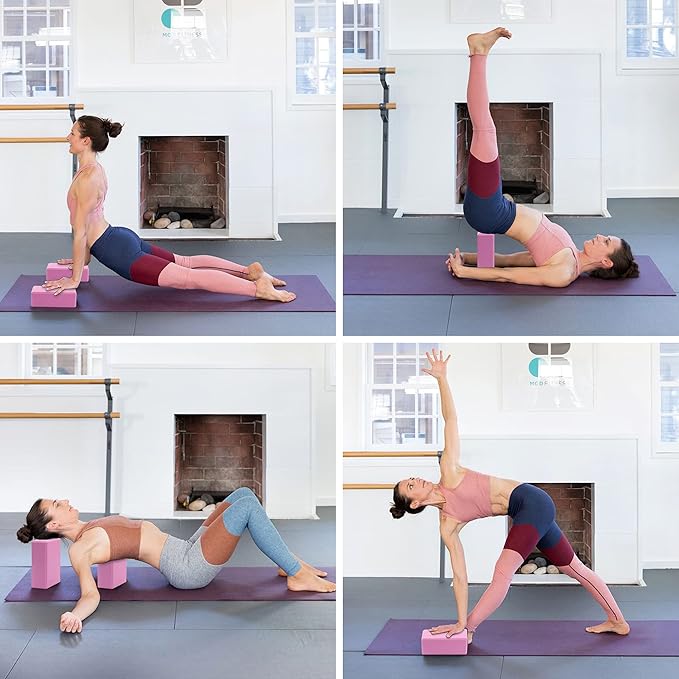 • ★🧘‍♀️[2 YOGA BLOCKS WITH STRAP ASSIST]:Two durable foam blocks (9” x 6” x 3”) for proper positioning and support.Yoga block is made of environmental protection EVA material,each 0.44 lb,moderate hardness,higher density,better quality,more stable and safe.Yoga blocks with strap is very suitable for beginners to slowly improve the coordination and stability of the body and advantage to prevent injuries.