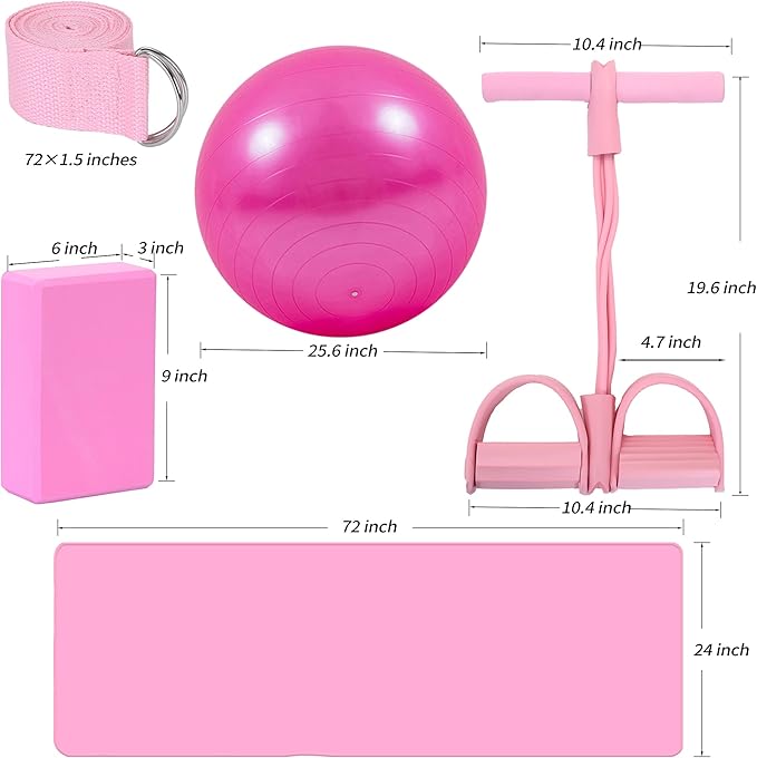 • ★🧘‍♀️[11 PIECES YOGA MAT SET FOR BEGINNERS]:The yoga set combination includes 72" x 24" x 0.4" yoga mat with carrying strap yoga net bag, 9" x6" x 3" yoga blocks 2 pack, 25.6" yoga ball, 72" x 1.5" yoga strap,pedal ankle puller,air pump, air lock and air lock puller for yoga beginners exercise.With this yoga starter kit, You can exercise at home, in the gym, outdoors, anytime, anywhere.