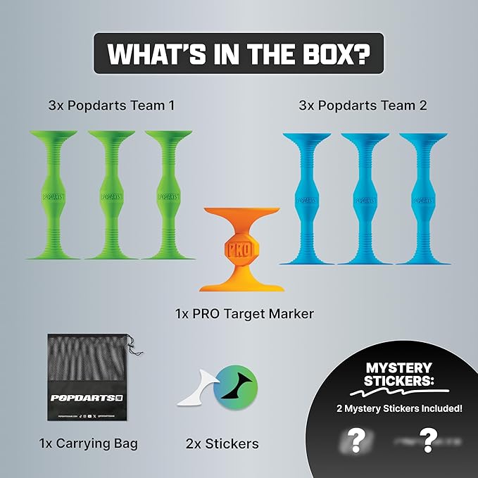 - WHAT’S INCLUDED IN A SET? 3 Blue Popdarts | 3 Green Popdarts | 1 Orange Target Marker | 1 Mesh Carrying Bag with rules printed right on the bag