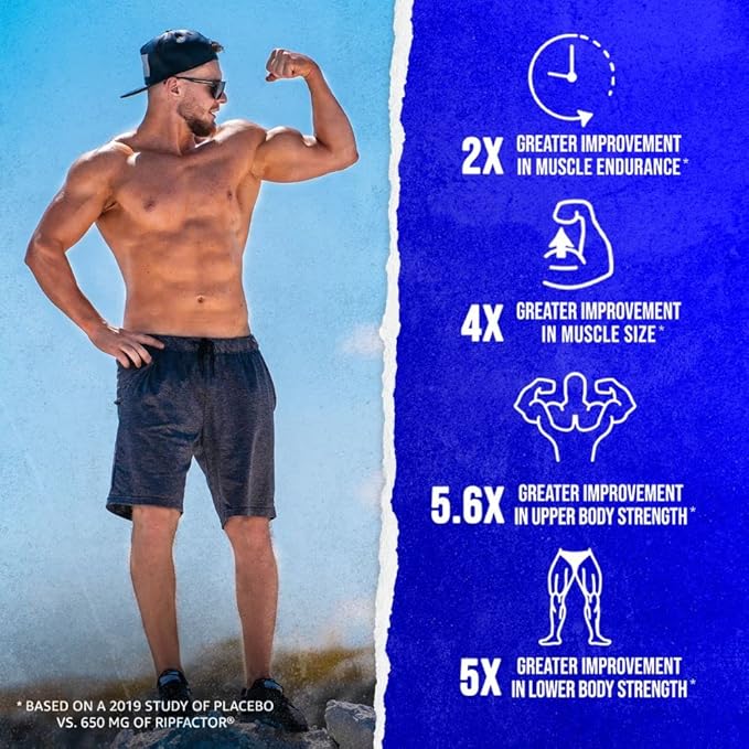 - MORE STRENGTH: The ultimate supplement for muscle strength. Studies have shown RipFACTOR to provide 5.6x greater improvement in upper body strength and 5x greater improvement in lower body strength when compared to a placebo. These capsules are sure to help you crush your next workout.
