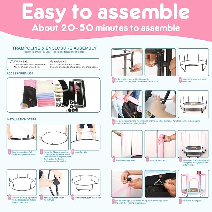 - PACKAGE CONTAINS - One trampoline, safety net, springs cover pad, jump pad, rust-proof steel pipe, pull tool (T-Hook), trampoline basketball hoop, 6 pcs large suction cups, 10 pcs pit ball, trampoline accessories and all the installation tools you need.