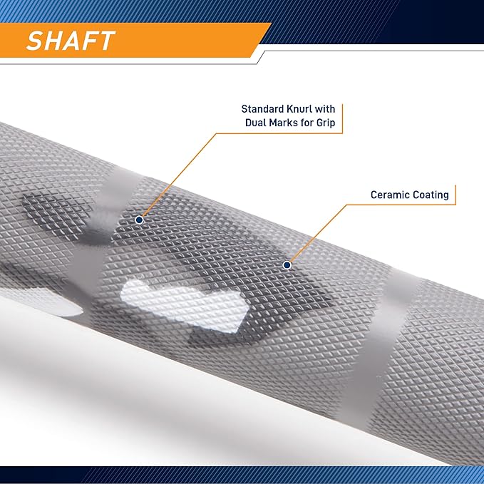 - Lighter knurling marks on the shaft of the Olympic bar are coated with ceramic, which increases friction between your hands and the bar, therefore improving overall grip