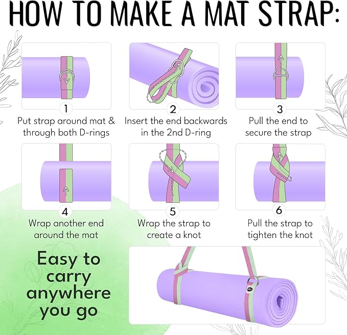 - STRONG & COMFY: Our yoga belts are made from high-quality cotton blend with eco-friendly yarn dyeing. It is non-elastic, durable and easy-to-clean material. The thick tight weave yet delicate soft-to-skin texture of the belt ensures both durability when carrying the mat and comfort during and comfort during practice. The D-ring loops are made from sturdy corrosion-resistant stainless steel and holds the yoga strap.