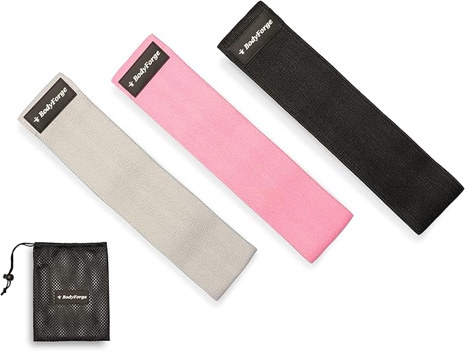 - PREMIUM EXERCISE BANDS: BodyForge Fabric Hip resistance bands come in 3 varying resistance levels (Light 14-25lbs, Medium 25lbs -35lbs, Heavy 40lbs-50lbs). Made with a soft cotton material, these wide bands offer comfort while preventing pinching and snapping. The built in latex grip prevent the band from slipping or rolling while exercising. The 14″ by 3″ bands offer a great variety of exercise options whether you are just beginning your workout journey or been working out for years.
