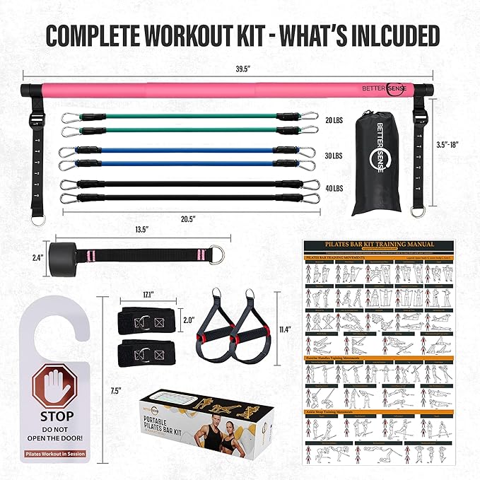 - TRANSFORM YOUR BODY ANYWHERE: Crush your fitness goals with this home pilates kit. You can use this complete Pilates bar kit to target legs, glutes, core, and arms. Comes with a heavy duty steel workout bar that makes this Pilates essentials kit for women ideal for beginners or advanced individuals alike, stackable from 40 to 180lbs.