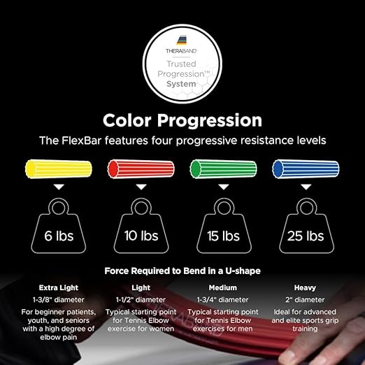 - IMPROVE GRIP & ARM STRENGTH: Designed to strengthen hands, wrists, and forearms while helping relieve pain from conditions like tennis or golfer’s elbow and tendonitis, the THERABAND FlexBar is widely used in rehab, sports training, and occupational therapy