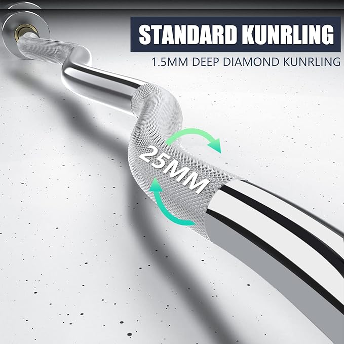 - DIAMOND KNURLING SHAFT: The deep diamond knurling of the curling bar can increase friction and help athletes hold the shaft firmly even when sweating, Avoid injury caused by slipping