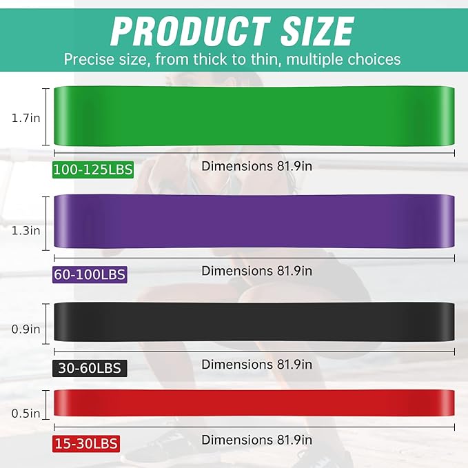 - Different Color & 4 Pull Up bands levels: Set of 4 pcs Pull up assist bands correspond to different colors, Red(15-30 lbs), Black(30-60 lbs), Purple (60-100 lbs), Green (100-125 lbs),81 inches in length and can be used alone or combine multiple workout bands to increase the challenge.