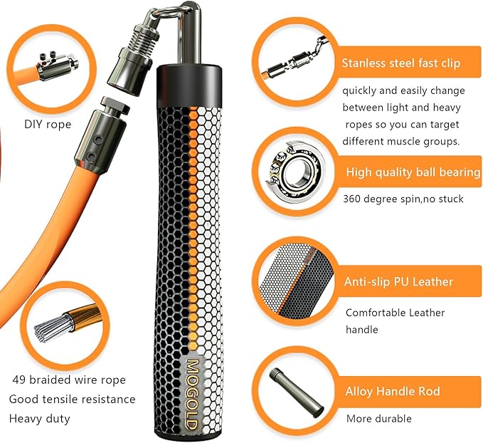 - Special Feature : Ergonomic, Fast interchangeable jump ropes from light to weight, Kink Resistant, Slip Resistant, Weighted-1/5lb 1/4lb 1/2lb Ergonomic, Fast interchangeable jump ropes from light to weight, Kink Resistant, Slip Resistant, Weighted-1/5lb 1/4lb 1/2lb