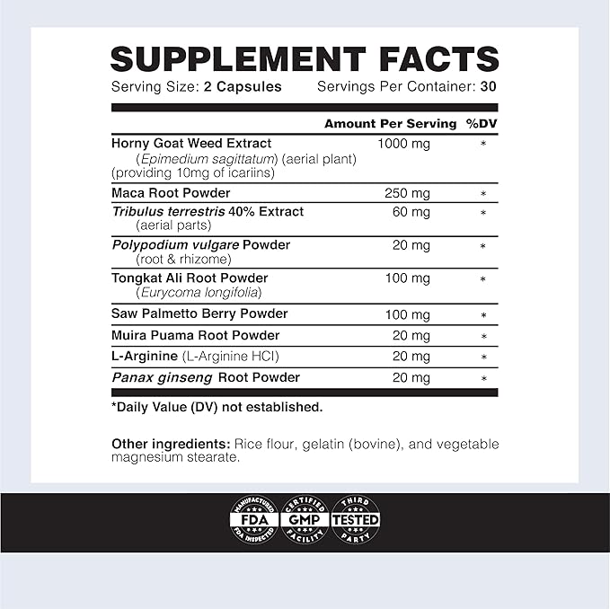 - Special Ingredients : Horny Goat Weed, Maca Root Powder, Tribulus Terrestris