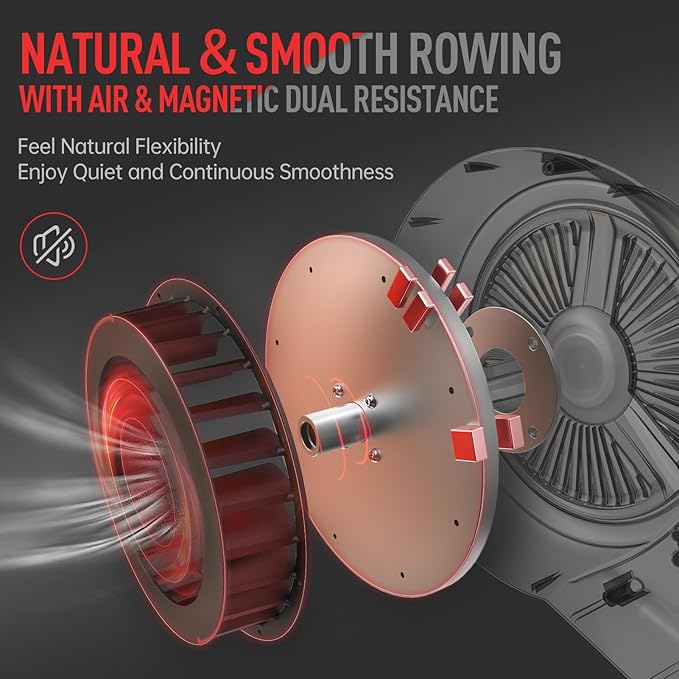 - 【UPGRADED DUAL RESISTANCE SYSTEM】With a unique dual resistance system that combines air and magnetic resistance, the 32 blades, paired with a 10lb flywheel, provide a dual resistance performance that far exceeds that of ordinary rowing machines for home use, offering you the exceptional experience of a professional commercial-grade rowing machine.