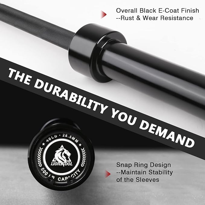 - Premium Bearing and Bushing: For those who are tired of tightening the hex bolt end sleeves, LIONSCOOL Olympic Bar is for you. Our sleeves with the snap rings at both ends maintain stability for a lifetime. This 500LBS bars weighs 40LBS while featuring ball bearings and oil-impregnated brass bushings providing smooth rotation. You will feel the difference between this bar and other bushing operated bars at once.