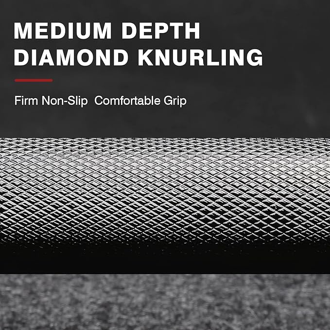 - Medium Depth Knurling with a Center Knurl: LIONSCOOL 40LBS Olympic barbell offers 1.5mm diamond knurl with flattened top for a secure and non-slip grip while not being too aggressive. The 4.7” center knurl is most helpful when doing back squats. It grips your back and helps the bar to stay safely in place.
