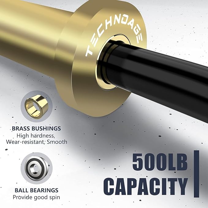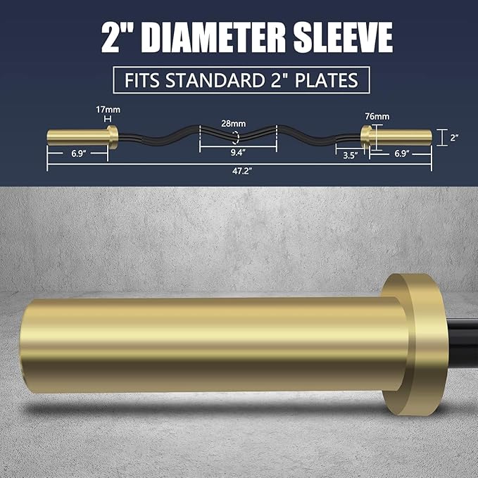 - PRODUCT INFORMATION: EZ curl bar is 47" long, 20lb weight, and 500lb capacity. Black shaft and gold sleeves with 2 ball bearings and 2 brass bushings, which are suitable for 2" barbell plates and can provide good rotation