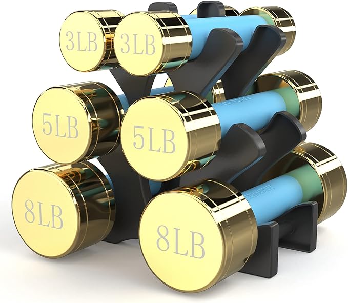 - Multi-Weight Dumbbell Set: Dumbbell sets includes pairs of accurate weight 3lb, 5lb, and 8lb dumbbells, along with a storage rack. Available in black, pink, blue, and rose, these sets are perfect for resistance training and various workouts
