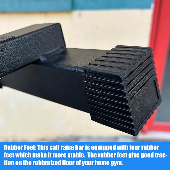 - Rubber Feet:This calf raise bar is equipped with four rubber feet which make it more stable. The rubber feet give good traction on the rubberized floor of your home gym. Without strong rubber smell and can protect your floor.