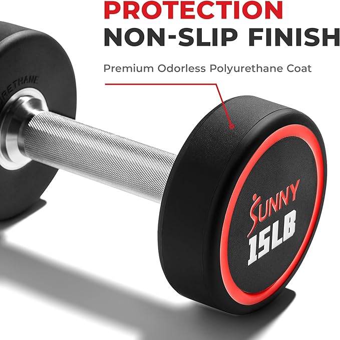 Sunny Health & Fitness Premium Polyurethane Commercial Grade Round Dumbbells with Diamond Knurled Handle, Durable Strength Training Equipment for Home Gym, 5-50LB