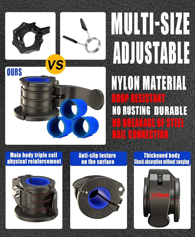 - ✔MULTI-SIZE:Our Barbell collars can meet all your size needs. Unique design weight bar clamps accessories upgrade, accurate to every millimeter :1inch 23MM,24MM,25.4MM 27MM 28MM and 30MM ,The piston handle can adjust the tightness by itself, it will not loosen over time, durable, choose it you no longer worry about the Size mismatch problem!