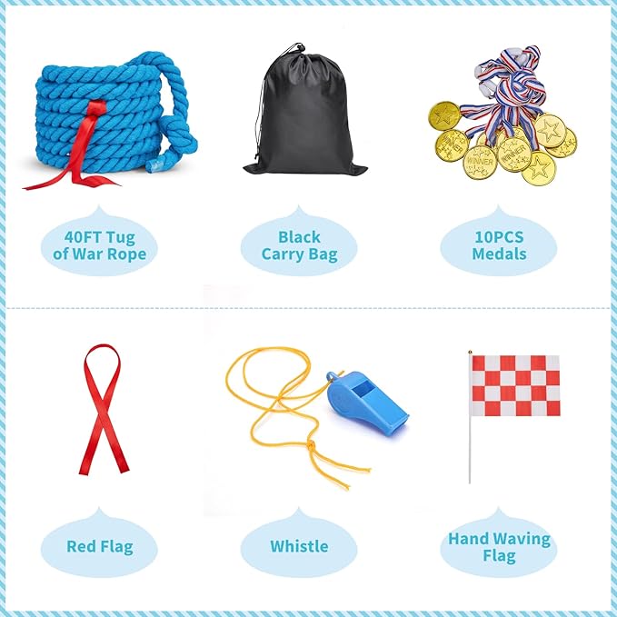 - More Giveaways;The set comes with 10 gold medals, 1 black carry bag, 1 red flag, 1 whistle, and 1 hand waving flag. Let your kids fully enjoy the tug of war rope game.