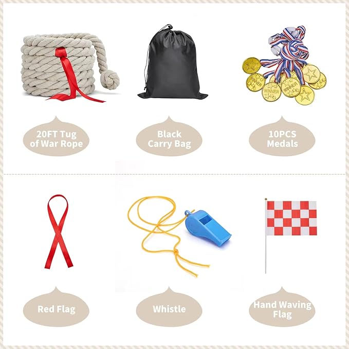 - More Giveaways;The set comes with 10 gold medals, 1 black carry bag, 1 red flag, 1 whistle, and 1 hand waving flag. Let your kids fully enjoy the tug of war rope game.
