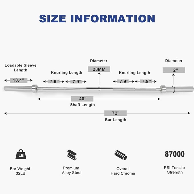 - Specifications: Full length is 72” (6ft); Weighs 32LBS; 500 pounds weight capacity; 87,000 PSI tensile strength; 28mm handgrip diameter; Single knurl mark; No center knurl. Shaft length is 48’’; Loadable sleeves are 10.4” long and 2” in diameter to fit any Olympic weight plates.