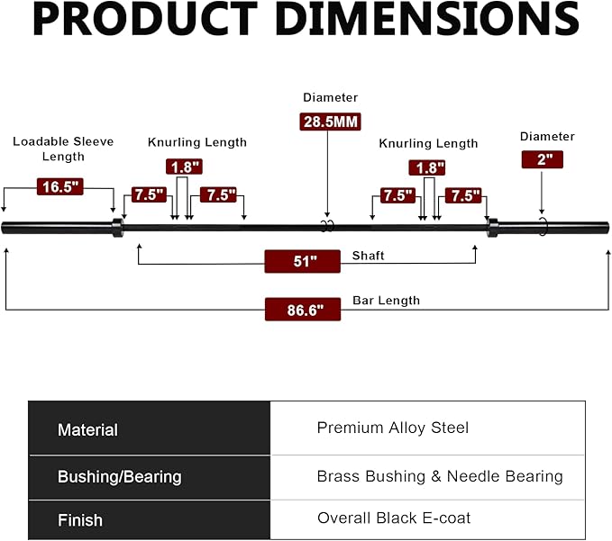 - Pro-Grade Specs: 86.6” length, 20 kg (~44 lb) weight. 28.5mm grip diameter, 51” shaft, and 16.5” sleeves compatible with all Olympic weight plates.