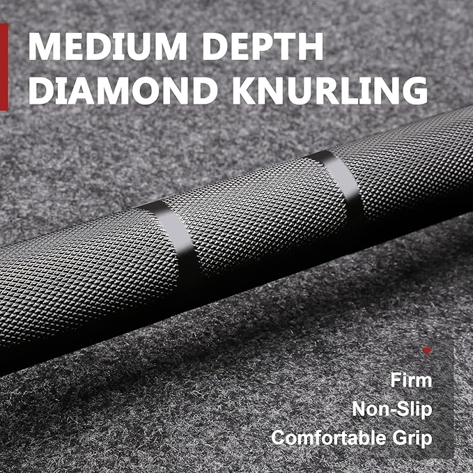 - Optimal Grip & Control: 1.5mm medium-depth diamond knurling with flattened top for a secure and non-slip grip while not being too aggressive. Features dual knurl marks for correct hand positions in both Olympic weightlifting and heavier powerlifting.