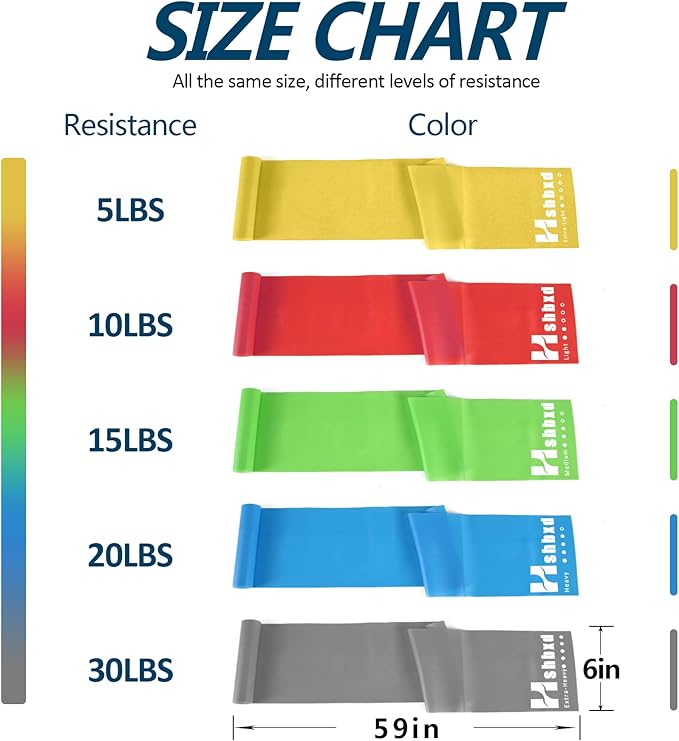 - 5 Levels Of Resistance - 5 resistance bands are 59in (150cm) long and 5.9in (15cm) wide, the resistance bands is yellow band (5 lbs), red band (10 lbs), green band (15 lbs), blue strap (20 lbs), gray strap (30 lbs).