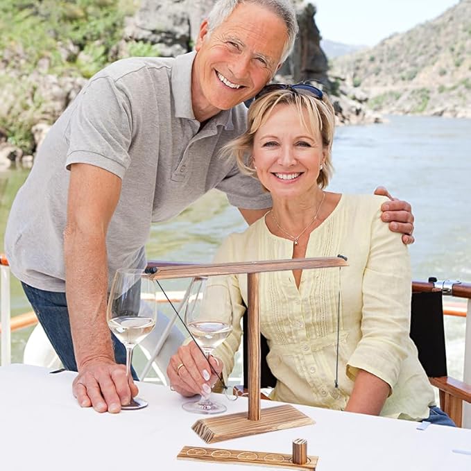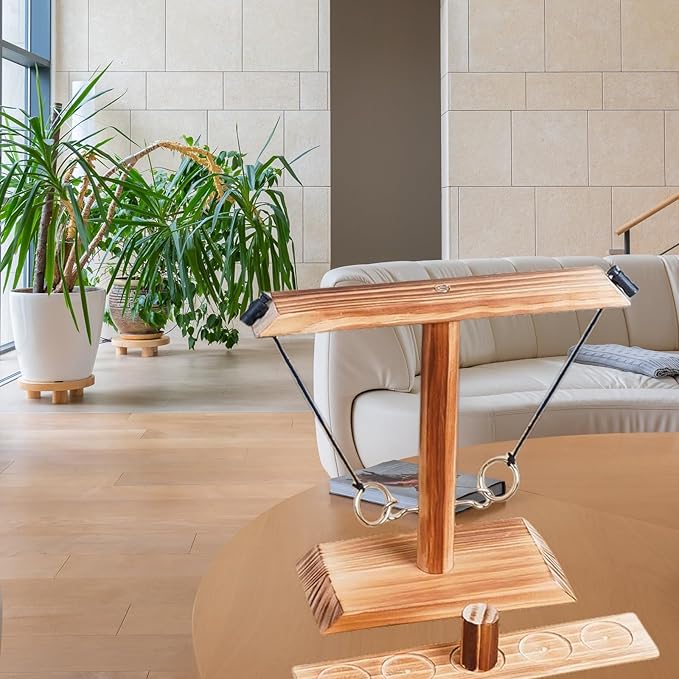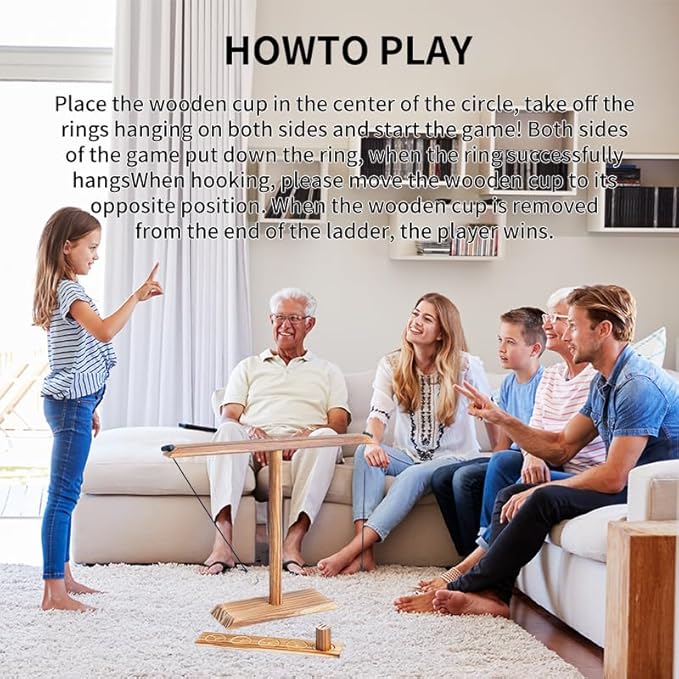 - Fun game :The 2 player game is to place the wooden cup in the middle of the circle, pick up the circle and go! For each hook you take, move the wooden cup 1 space towards your opponent. The player wins when the wooden cup is moved away from the end of the ladder. Agree on a bet with your competitor before the game and play each style of game.
