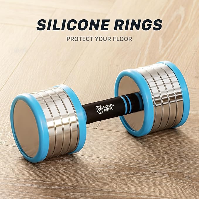 - SUITABLE FOR HOME USE: The dumbbells are compact and can stand upright, making them easy to store. Most importantly, they do not give off any odours, which is a benefit for your workout and storage at home. The upgraded silicone rings easily fit over the end caps, protecting the dumbbells and your floor.