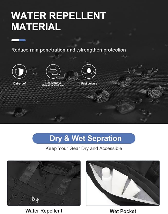 - 【Waterproof & Dry Wet Pocket】The bag is made from high-density waterproof material to repel water and keep the contents inside dry. The bag has a compartment designed specifically for separating dry items from wet ones like wet clothes or towels