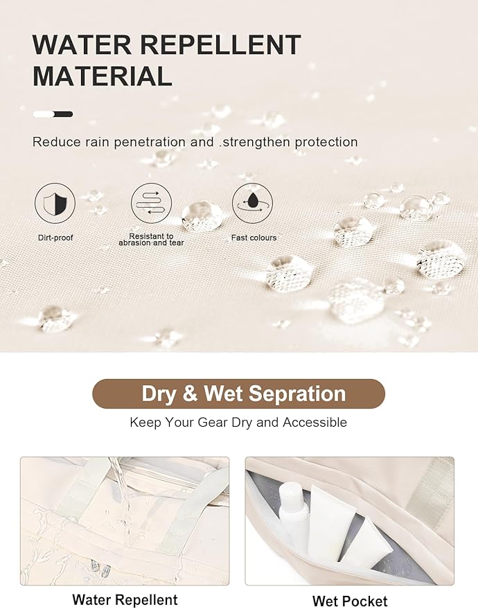- 【Waterproof & Dry Wet Pocket】The bag is made from high-density waterproof material to repel water and keep the contents inside dry. The bag has a compartment designed specifically for separating dry items from wet ones like wet clothes or towels
