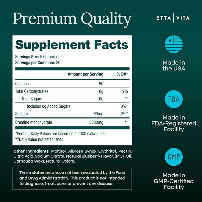 - High-Quality Lab-Tested Ingredients - Our mono-hydrate gummies are manufactured, tested, and bottled in our GMP-certified facilities. Etta Vita is committed to the highest quality ingredients and manufacturing processes.
