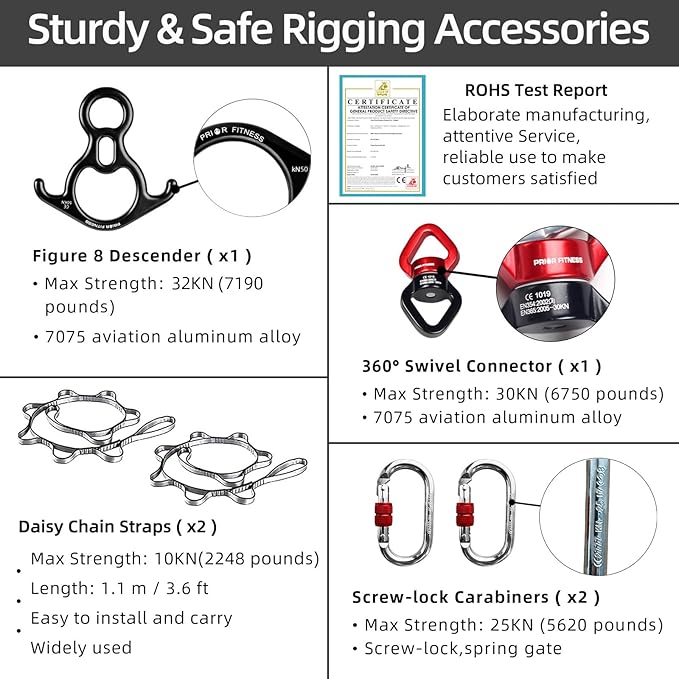 - 【Safety Tested & Guarantee】Aerial Silk is CE certified, SGS tested and recommended by certified aerial yoga teachers, Figure 8 Descender rated up to 32KN (7190pounds), 360°Swivel Connector (EN Certified) rated up to 30KN(6750 pounds), Daisy Chain Straps rated up to 10KN(2248 pounds),Screw-lock Carabiners (CE & EN Certified) rated up to 25KN(5620 pounds)