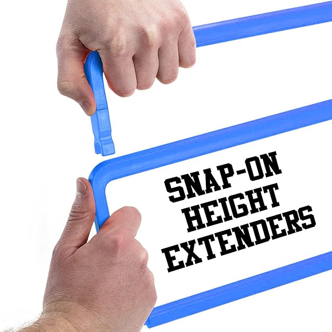 • SNAP ON EXTENDERS: Increase workout intensity levels with two height extenders per hurdle, snap on and adjust hurdles to heights of 6", 9.25", 11.75", and 15". Each hurdle is a standard size of 18inch wide.