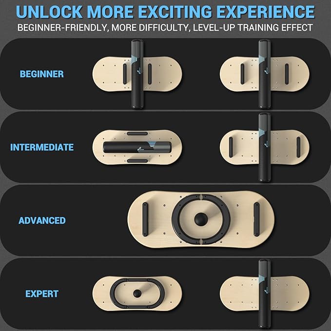 - 2-in-1 Versatile Set: Each set comes with 1 balance board, 1 roller and 1 ball that provides 7 unique challenge modes, allowing you to progressively work your way up to improve your strength and balance. Plus, the 4 individual magnetic removable stoppers ensure smooth switch between modes and convenient disassembling