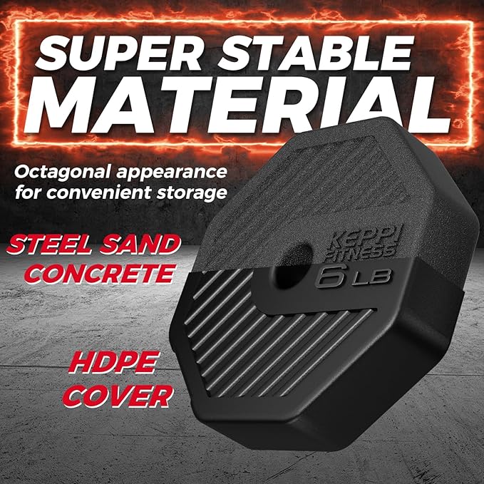 - Sturdy Material - Octagonal shape design, anti rolling and easy to take. The environmentally friendly dumbbell plate shell is made of high quality PE material to prevent damage to the floor and rust, and has no odor. The interior is filled with a mixture of cement and iron sand to ensure zero leakage.