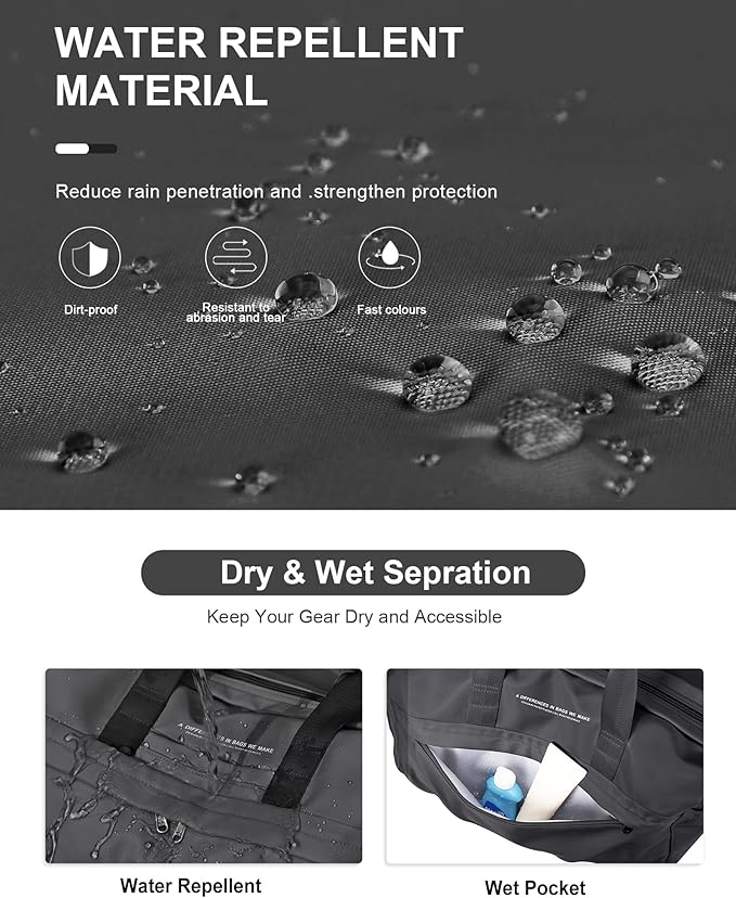 - 【Waterproof & Dry Wet Pocket】The bag is made from high-density waterproof material to repel water and keep the contents inside dry. The bag has a compartment designed specifically for separating dry items from wet ones like wet clothes or towels