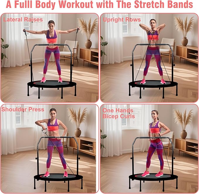 - 5-Level Adjustable Handlebar for Comfort & Safety - This fitness trampoline for adults features an adjustable handlebar with 5 height, ranging from 37 to 46 inches, to accommodate users of different heights. The adjustable handlebar not only enhances comfort but also improves stability and safety during exercises, making your workout more effective and secure