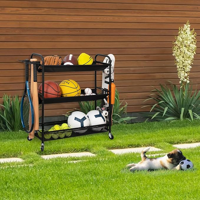 - 【MULTI-SCENE USE】: This sport equipment holder is great for garage,basement,storage room,playroom,gym,school,preschool and so on, can also use it as kids toy organizer at home, a sports gear display shelf in sport store. This rolling sports ball storage is really convenient for storing basketballs, footballs, soccer balls, volleyballs, tennis, softball and so on