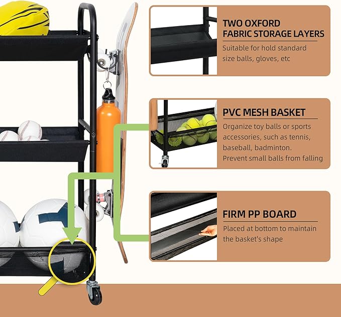 - 【DURABLE CONSTRUCTION】: This 3-Tier sports rack organizer is made of high quality black powder coating steel, rust resistant and durable, with 2 oxford fabirc storage layers and 1 PVC shelf baskets. This sports equipment storage rack will be a life-long use, as an indispensable role for garage ball organizer.